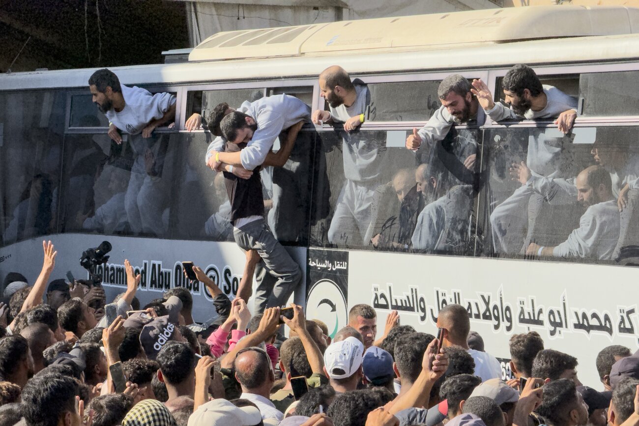 A bus carrying Palestinians released from Israeli prisons is greeted by a crowd outside the Nasser hospital, Gaza Strip, Oct 13, 2025